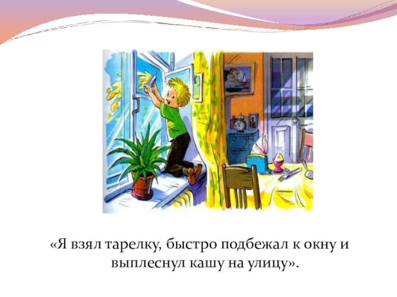 Слайд 24«Я взял тарелку, быстро подбежал к окну и выплеснул кашу на