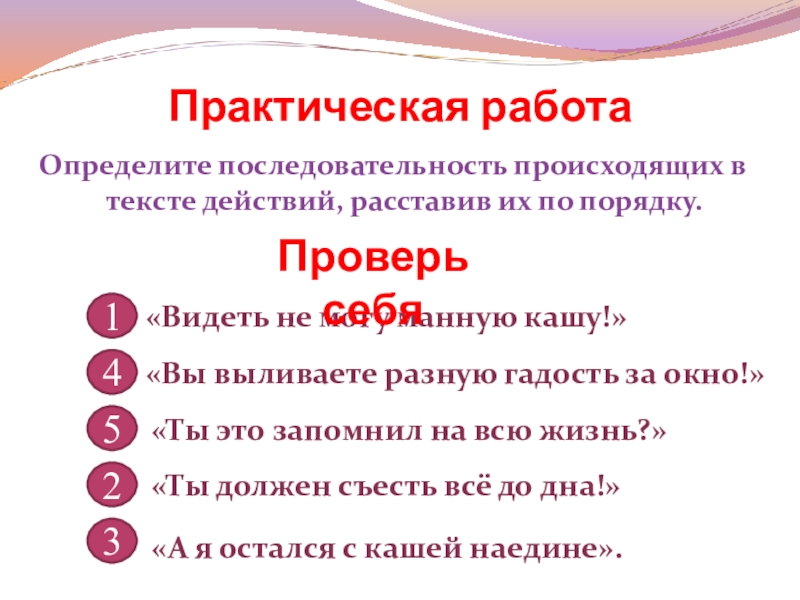 Определите последовательность происходящих в тексте действий, расставив их по порядку.