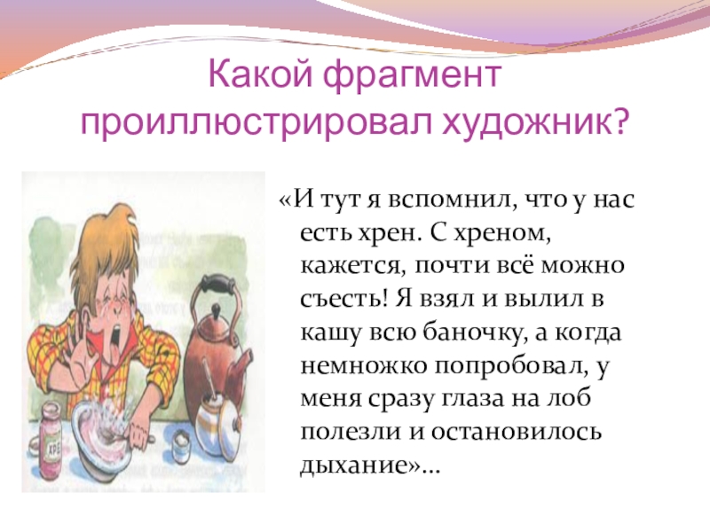 есть хрен. С хреном, кажется, почти всё можно съесть! Я взял и вылил в кашу всю баночку, а когда немножко попробовал, у меня сразу глаза на лоб полезли и остановилось дыхание»…