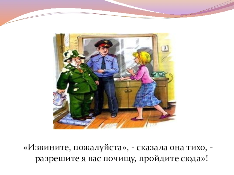 Слайд 25«Извините, пожалуйста», - сказала она тихо, - разрешите я вас почищу,