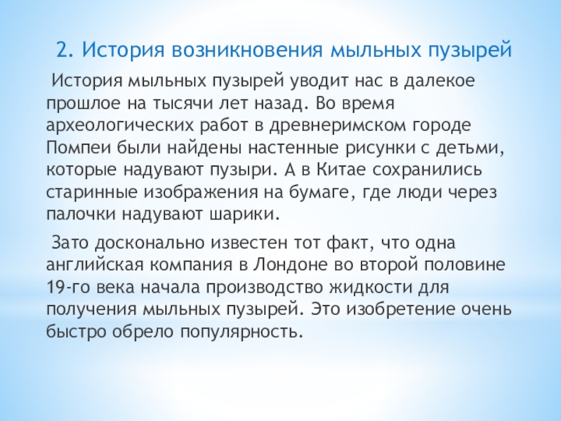 далекое прошлое на тысячи лет назад. Во время археологических работ в древнеримском городе Помпеи были найдены настенные рисунки с детьми, которые надувают пузыри. А в Китае сохранились старинные изображения на бумаге, где люди через палочки надувают шарики.