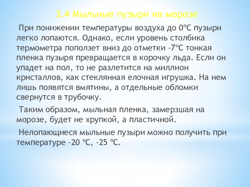 Нелопающиеся мыльные пузыри можно получить при температуре -20 ºС, -25 ºС.
