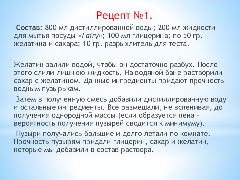 Пузыри получались большие и долго летали по комнате. Прочность пузырям придали глицерин, сахар и желатин, которые мы добавили в состав раствора.