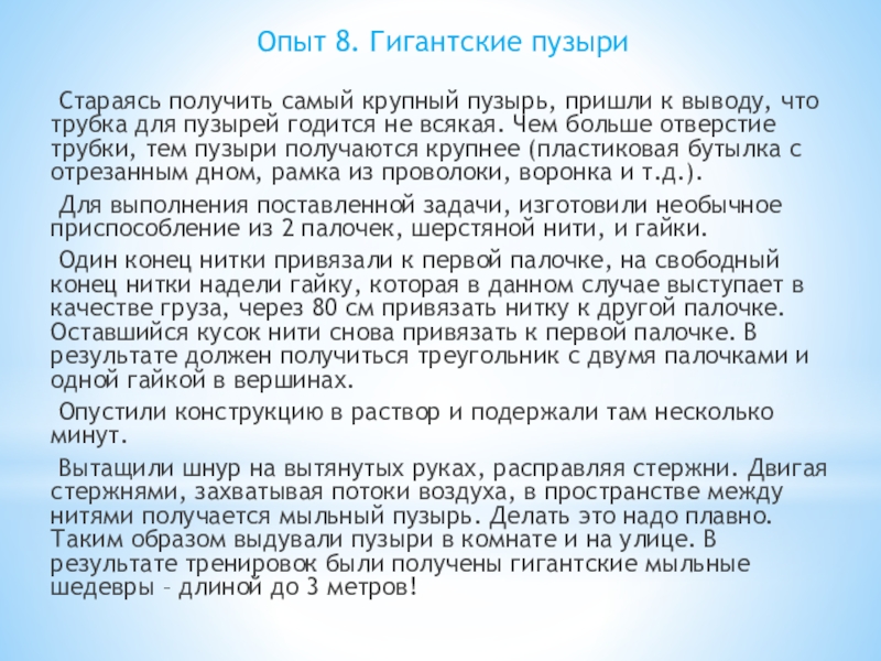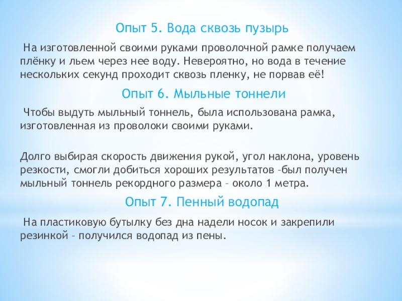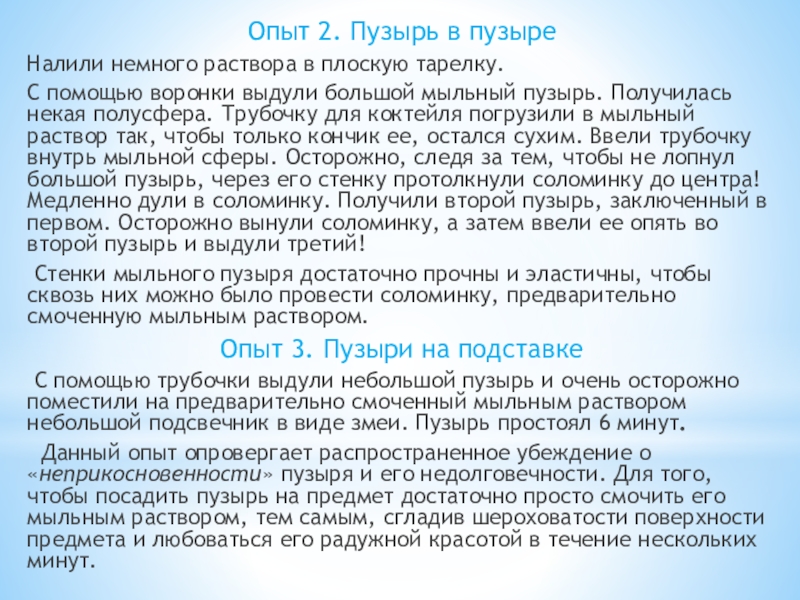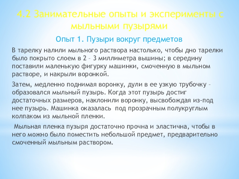 Слайд 16 4.2 Занимательные опыты и эксперименты с мыльными пузырями