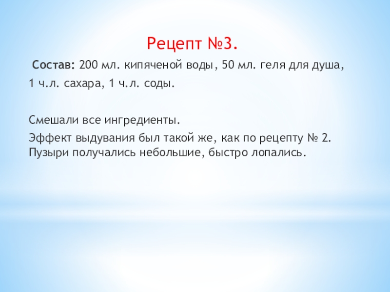 Эффект выдувания был такой же, как по рецепту № 2. Пузыри получались небольшие, быстро лопались.