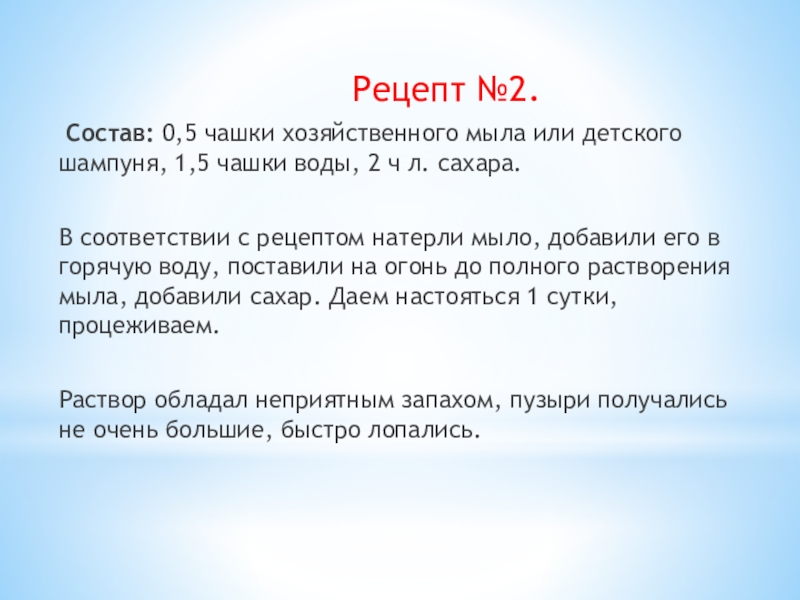 Раствор обладал неприятным запахом, пузыри получались не очень большие, быстро лопались.