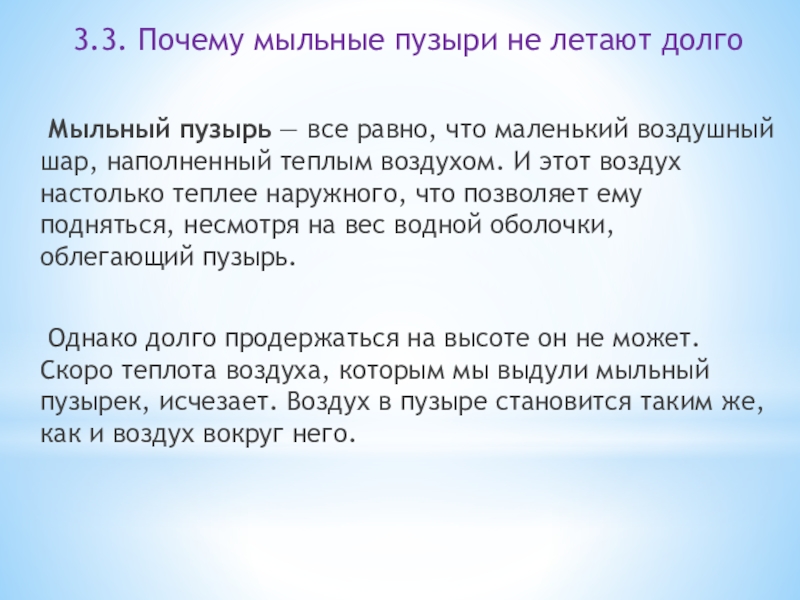 Слайд 73.3. Почему мыльные пузыри не летают долго