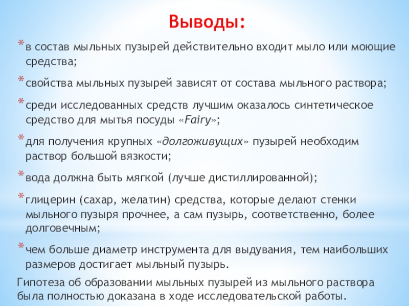 Гипотеза об образовании мыльных пузырей из мыльного раствора была полностью доказана в ходе исследовательской работы.