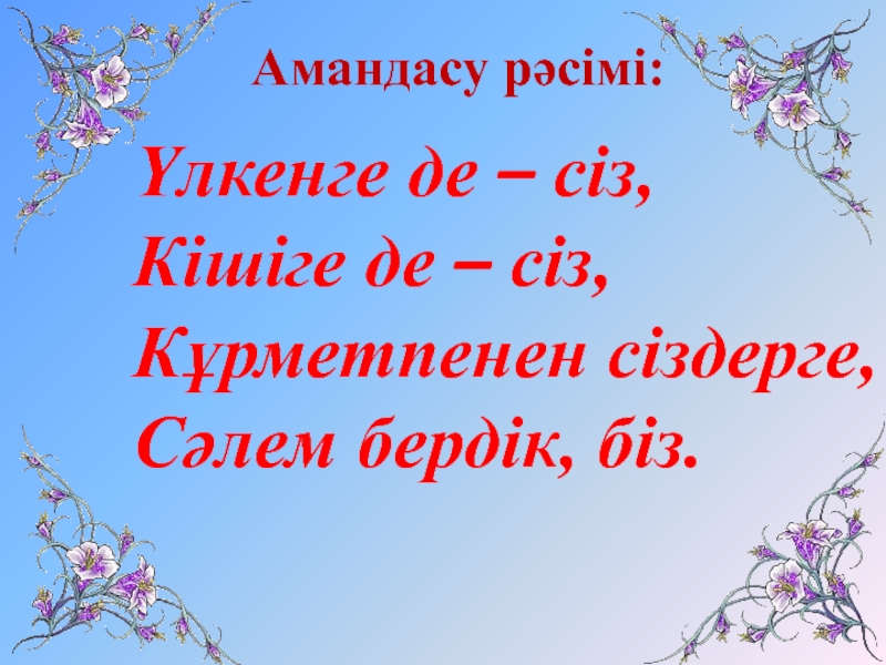 Үлкенге де – сіз,Кішіге де – сіз,Кұрметпенен сіздерге,Сәлем бердік, біз.Амандасу рәсімі: