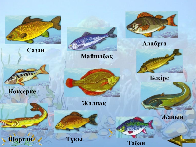 МайшабақСазанБекіреЖайынЖалпақ КөксеркеТабанТұқыШортанАлабұғаМайшабақСазан