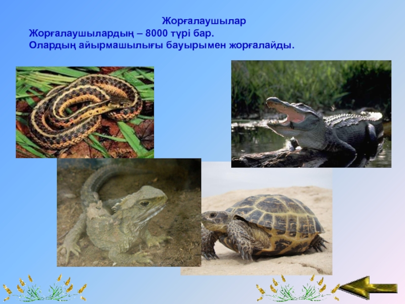 ЖорғалаушыларЖорғалаушылардың – 8000 түрі бар. Олардың айырмашылығы бауырымен жорғалайды.
