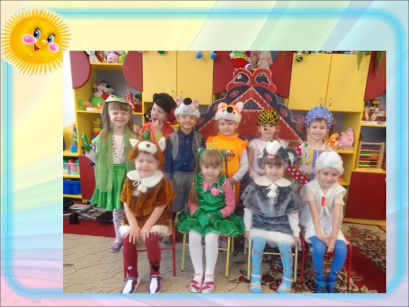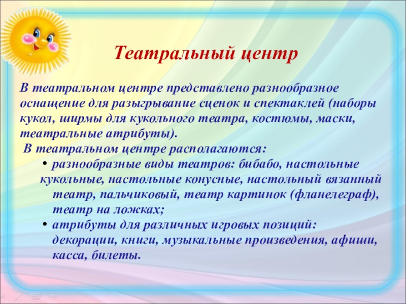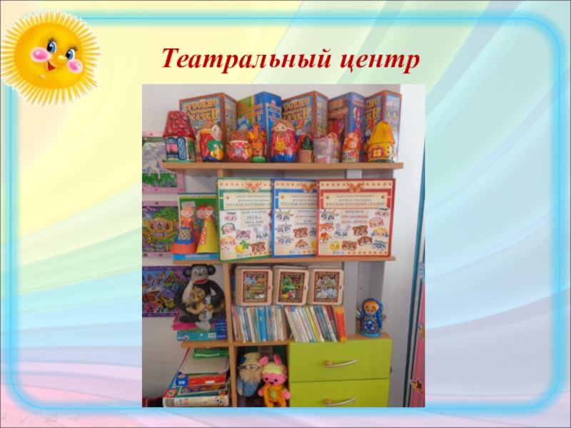 Слайд 48В театральном центре представлено разнообразное оснащение для разыгрывание сценок и спектаклей