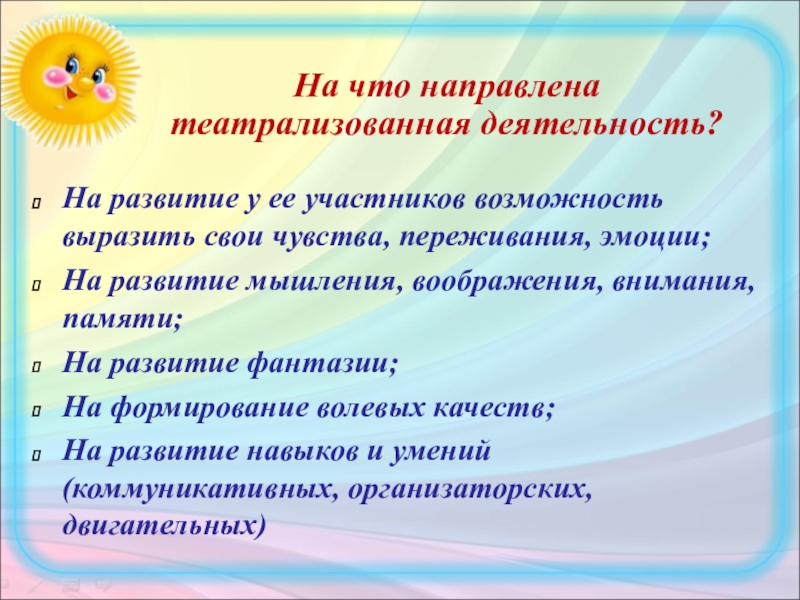 Слайд 5На что направлена театрализованная деятельность?