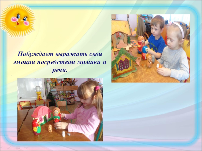Слайд 25Побуждает выражать свои эмоции посредством мимики и речи.