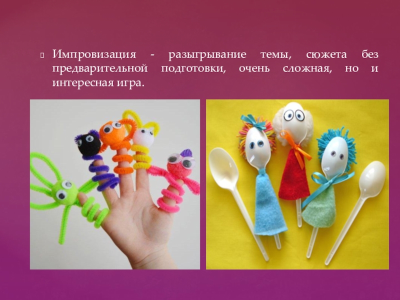Слайд 12Импровизация - разыгрывание темы, сюжета без предварительной подготовки, очень сложная, но