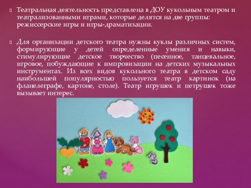 Слайд 7Театральная деятельность представлена в ДОУ кукольным театром и театрализованными играми, которые