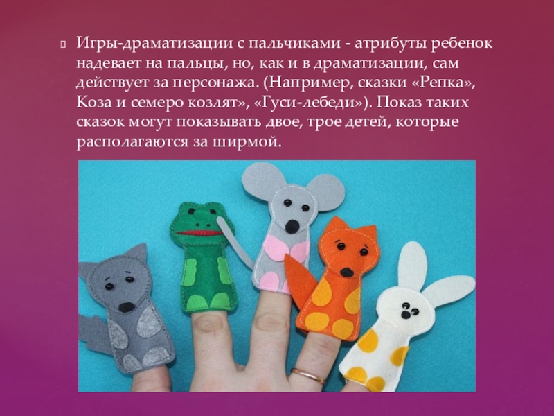 Слайд 10Игры-драматизации с пальчиками - атрибуты ребенок надевает на пальцы, но, как