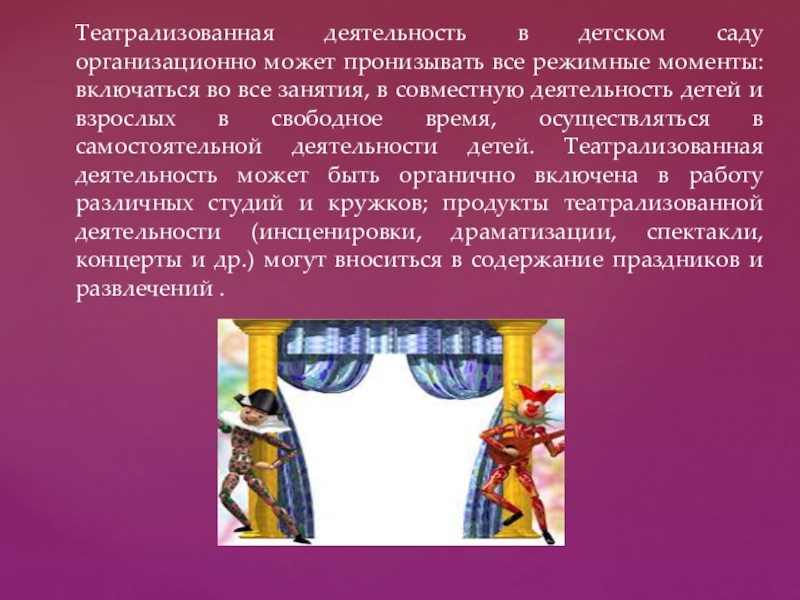 Слайд 2Театрализованная деятельность в детском саду организационно может пронизывать все режимные моменты: