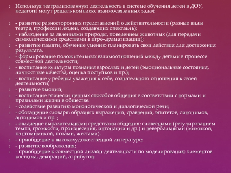 Слайд 6Используя театрализованную деятельность в системе обучения детей в ДОУ, педагоги могут