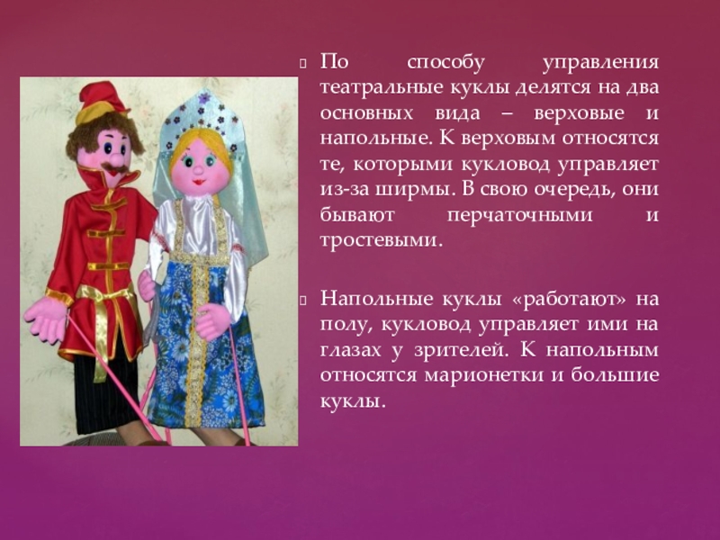 Слайд 8По способу управления театральные куклы делятся на два основных вида –