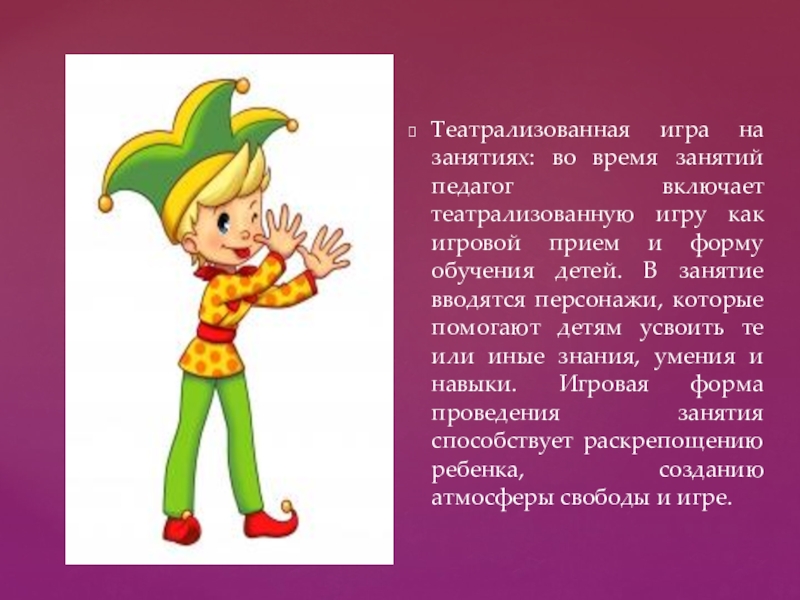Слайд 3Театрализованная игра на занятиях: во время занятий педагог включает театрализованную игру