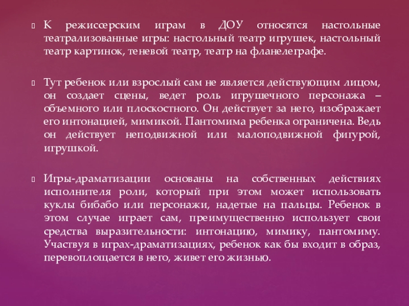Игры-драматизации основаны на собственных действиях исполнителя роли, который при этом может использовать куклы бибабо или персонажи, надетые на пальцы. Ребенок в этом случае играет сам, преимущественно использует свои средства выразительности: интонацию, мимику, пантомиму. Участвуя в играх-драматизациях, ребенок как бы входит в образ, перевоплощается в него, живет его жизнью.