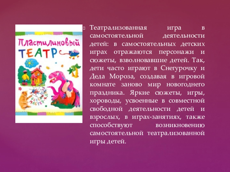 персонажи и сюжеты, взволновавшие детей. Так, дети часто играют в Снегурочку и Деда Мороза, создавая в игровой комнате заново мир новогоднего праздника. Яркие сюжеты, игры, хороводы, усвоенные в совместной свободной деятельности детей и взрослых, в играх-занятиях, также способствуют возникновению самостоятельной театрализованной игры детей.