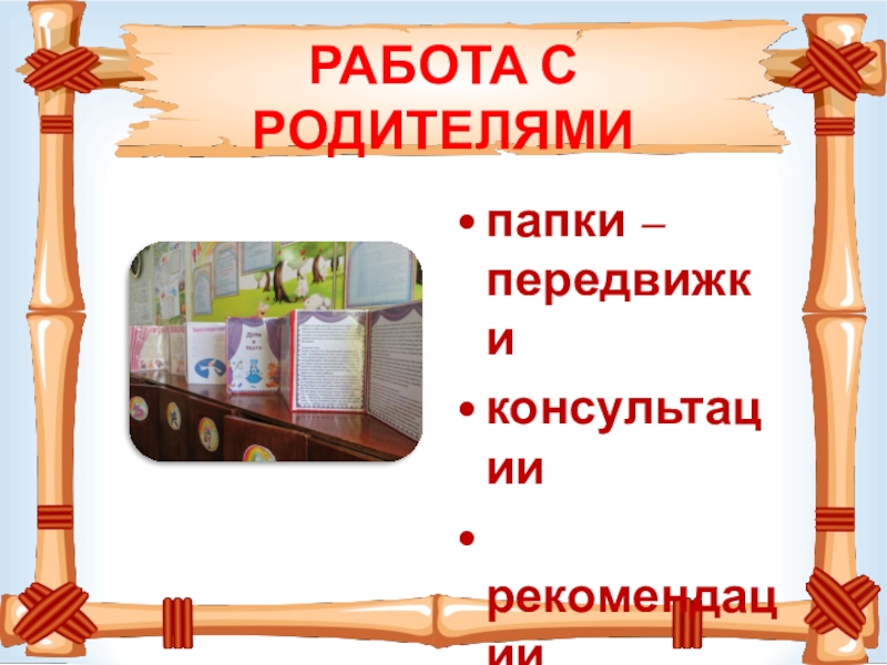 РАБОТА С РОДИТЕЛЯМИпапки – передвижкиконсультации рекомендациипамятки