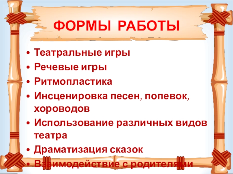 ФОРМЫ РАБОТЫТеатральные игрыРечевые игрыРитмопластикаИнсценировка песен, попевок, хороводовИспользование различных видов театраДраматизация сказокВзаимодействие с родителями