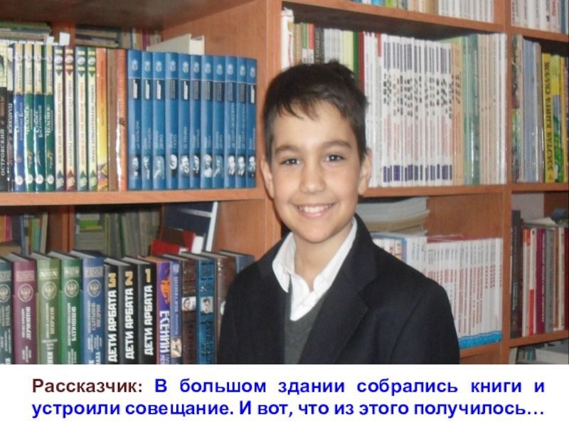 Слайд 3Рассказчик: В большом здании собрались книги и устроили совещание. И вот,
