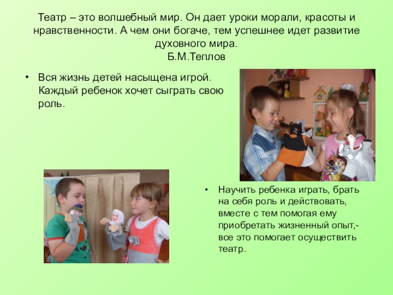 Научить ребенка играть, брать на себя роль и действовать, вместе с тем помогая ему приобретать жизненный опыт,- все это помогает осуществить театр.