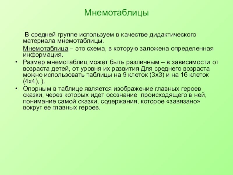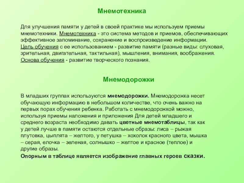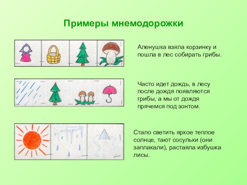 В младших группах используются мнемодорожки. Мнемодорожка несет обучающую информацию в небольшом количестве, что очень важно на первых порах обучения ребенка. Работать с мнемодорожкой можно, используя приемы наложения и приложения Для детей младшего и среднего возраста необходимо давать цветные мнемотаблицы, так как у детей лучше в памяти остаются отдельные образы: лиса – рыжая плутовка, цыплята – желтого, у петушка – хохолок красного цвета, мышка – серая, елочка – зеленая, солнышко – желтое и красное (теплое) и другие образы.