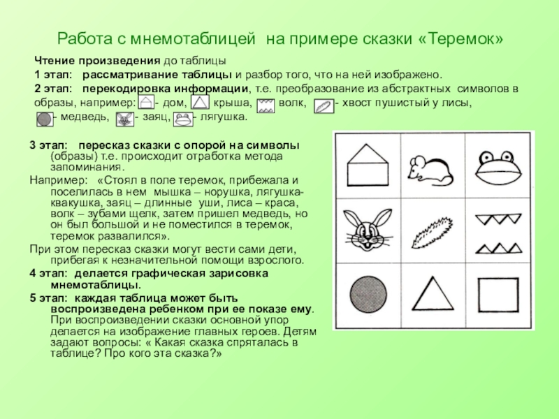 2 этап: перекодировка информации, т.е. преобразование из абстрактных символов в образы, например: - дом, - крыша, - волк, - хвост пушистый у лисы,