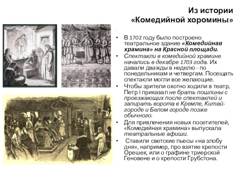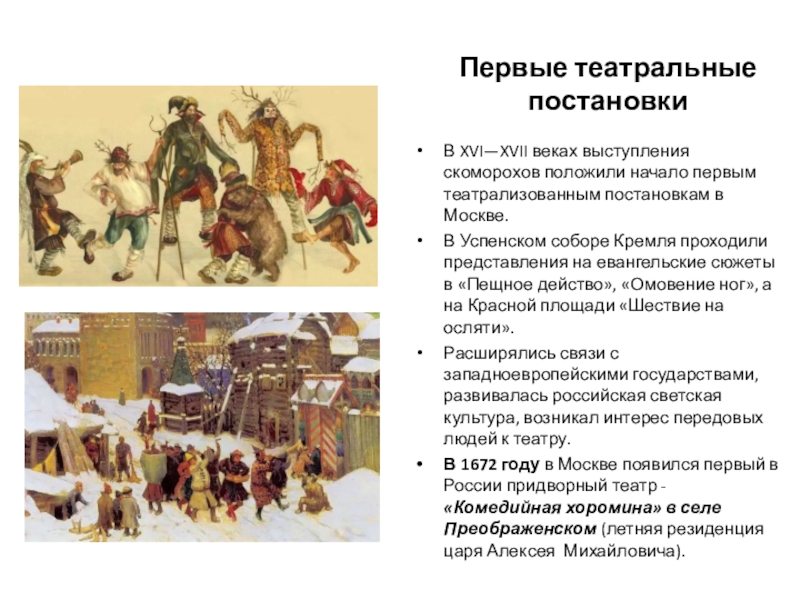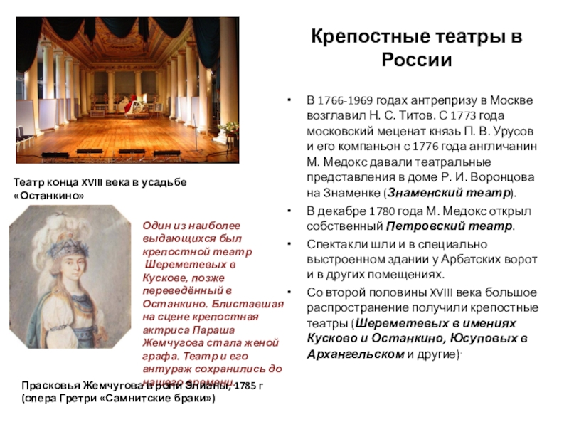 Шереметевых в Кускове, позже переведённый в Останкино. Блиставшая на сцене крепостная актриса Параша Жемчугова стала женой графа. Театр и его антураж сохранились до нашего времени.