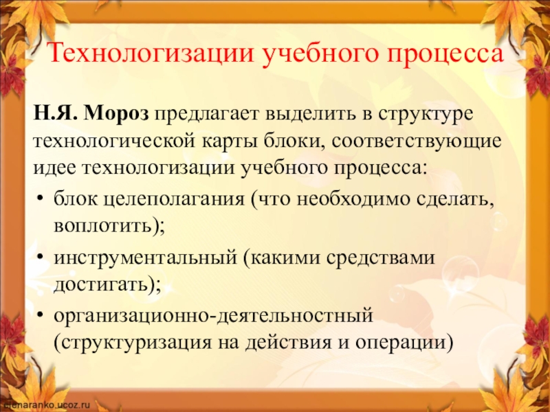 Н.Я. Мороз предлагает выделить в структуре технологической карты блоки,