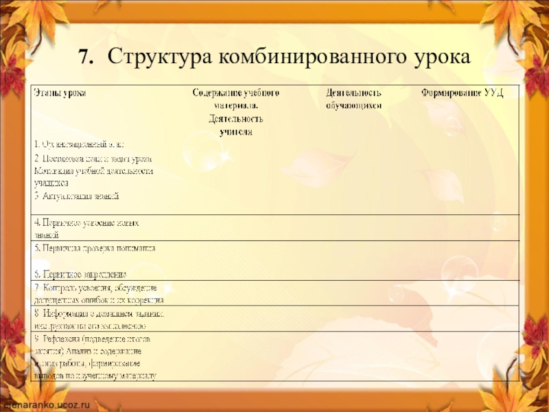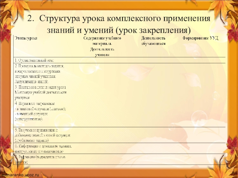 Слайд 172. Структура урока комплексного применения знаний и умений (урок закрепления)