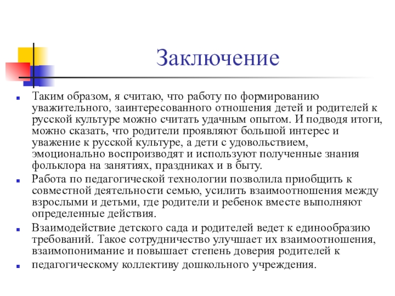 детей и родителей к русской культуре можно считать удачным опытом. И подводя итоги, можно сказать, что родители проявляют большой интерес и уважение к русской культуре, а дети с удовольствием, эмоционально воспроизводят и используют полученные знания фольклора на занятиях, праздниках и в быту.