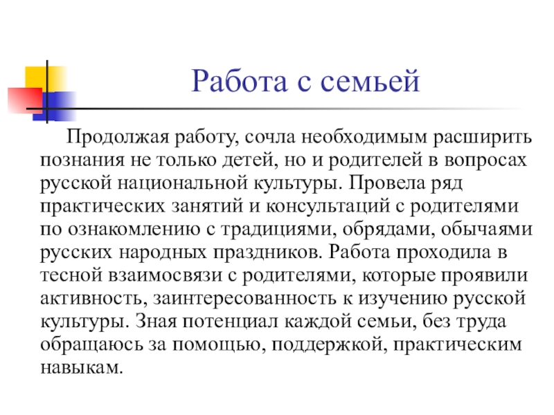 познания не только детей, но и родителей в вопросах русской национальной культуры. Провела ряд практических занятий и консультаций с родителями по ознакомлению с традициями, обрядами, обычаями русских народных праздников. Работа проходила в тесной взаимосвязи с родителями, которые проявили активность, заинтересованность к изучению русской культуры. Зная потенциал каждой семьи, без труда обращаюсь за помощью, поддержкой, практическим навыкам.