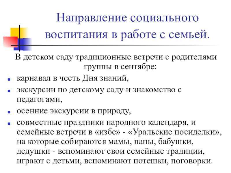 совместные праздники народного календаря, и семейные встречи в «избе» - «Уральские посиделки», на которые собираются мамы, папы, бабушки, дедушки - вспоминают свои семейные традиции, играют с детьми, вспоминают потешки, поговорки.
