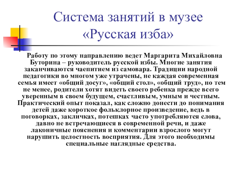 Работу по этому направлению ведет Маргарита Михайловна Буторина – руководитель русской избы. Многие занятия заканчиваются чаепитием из самовара. Традиции народной педагогики во многом уже утрачены, не каждая современная семья имеет «общий досуг», «общий стол», «общий труд», но тем не менее, родители хотят видеть своего ребенка прежде всего уверенным в своем будущем, счастливым, умным и честным. Практический опыт показал, как сложно донести до понимания детей даже короткое фольклорное произведение, ведь в поговорках, закличках, потешках часто употребляются слова, давно не встречающиеся в современной речи, и даже лаконичные пояснения и комментарии взрослого могут нарушить целостность восприятия. Для этого необходимы специальные наглядные средства.