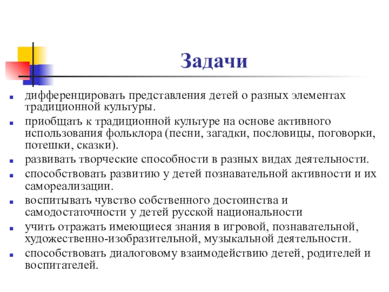 дифференцировать представления детей о разных элементах традиционной культуры.