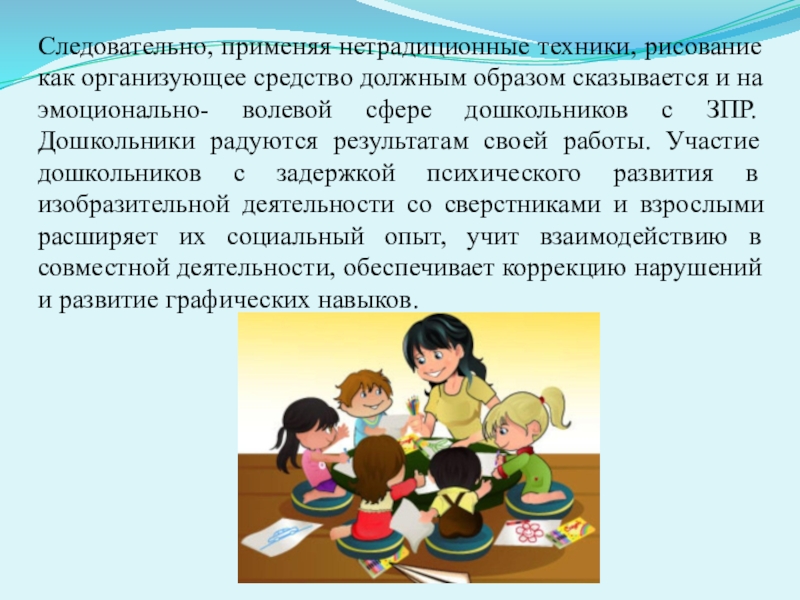 и на эмоционально- волевой сфере дошкольников с ЗПР. Дошкольники радуются результатам своей работы. Участие дошкольников с задержкой психического развития в изобразительной деятельности со сверстниками и взрослыми расширяет их социальный опыт, учит взаимодействию в совместной деятельности, обеспечивает коррекцию нарушений и развитие графических навыков.