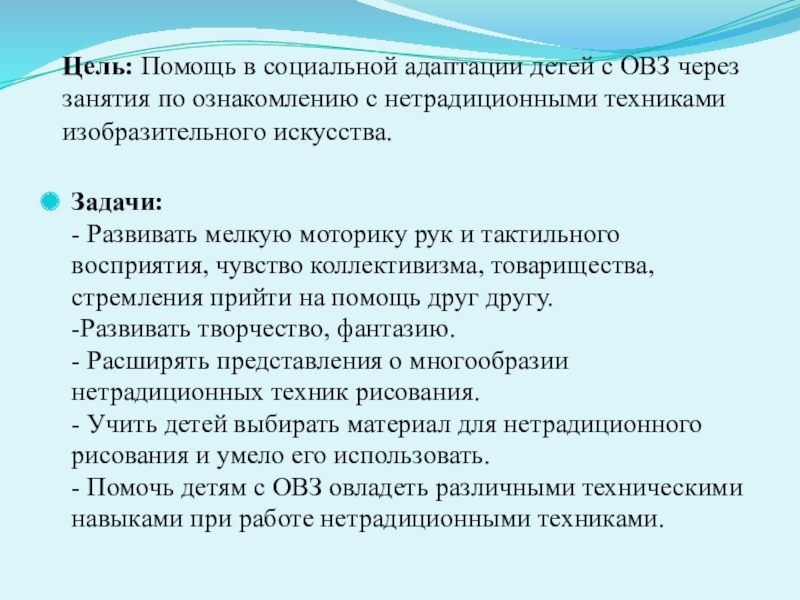 - Помочь детям с ОВЗ овладеть различными техническими навыками при работе нетрадиционными техниками.