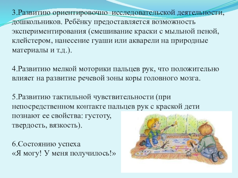 5.Развитию тактильной чувствительности (при непосредственном контакте пальцев рук с краской дети познают ее свойства: густоту,