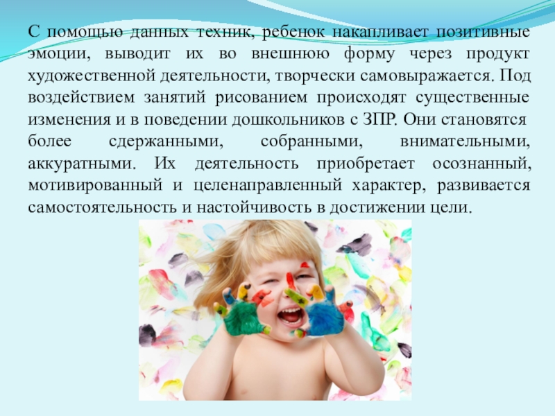 Слайд 14С помощью данных техник, ребенок накапливает позитивные эмоции, выводит их во