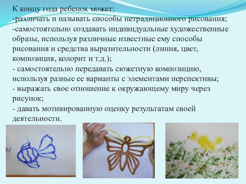 им. Нетрадиционные техники изображения не позволяют этого сделать. А это дает толчок к развитию воображения, творчества, самостоятельности, проявления индивидуальности.