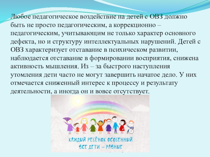 Слайд 5Любое педагогическое воздействие на детей с ОВЗ должно быть не просто
