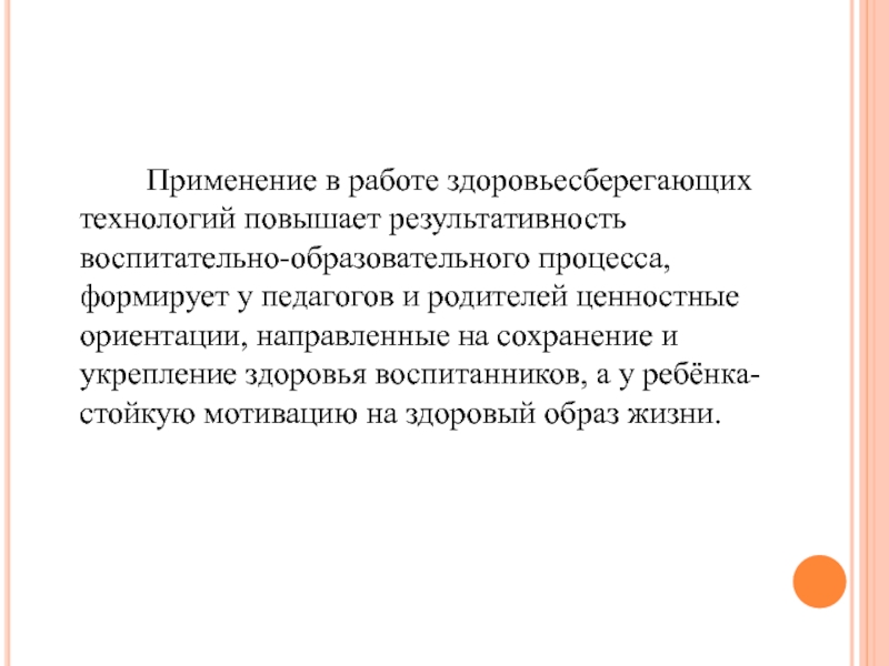 Применение в работе здоровьесберегающих технологий повышает результативность воспитательно-образовательного процесса, формирует у педагогов и родителей ценностные
