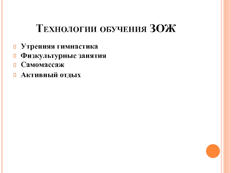 Технологии обучения ЗОЖУтренняя гимнастика Физкультурные занятия Самомассаж Активный отдых