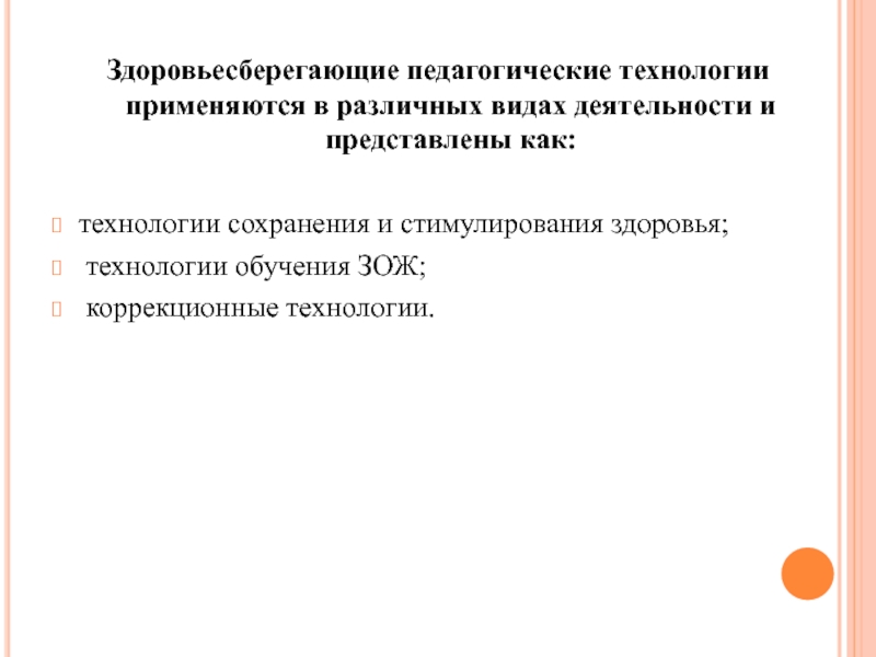 Здоровьесберегающие педагогические технологии применяются в различных видах деятельности и представлены как:технологии сохранения и стимулирования здоровья; технологии обучения